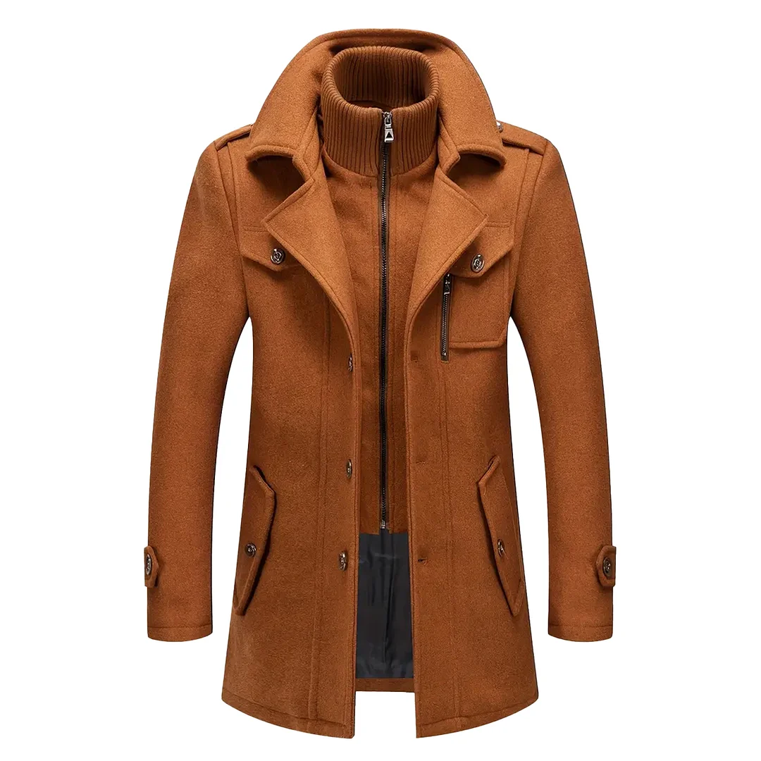 💥 2025 Hot Sale! Men's Fleece-blend Raincoat with Detachable Stand-up Collar, Single-breasted Design, and Zippered Pockets - Casual Autumn/winter Outerwear, Brown.