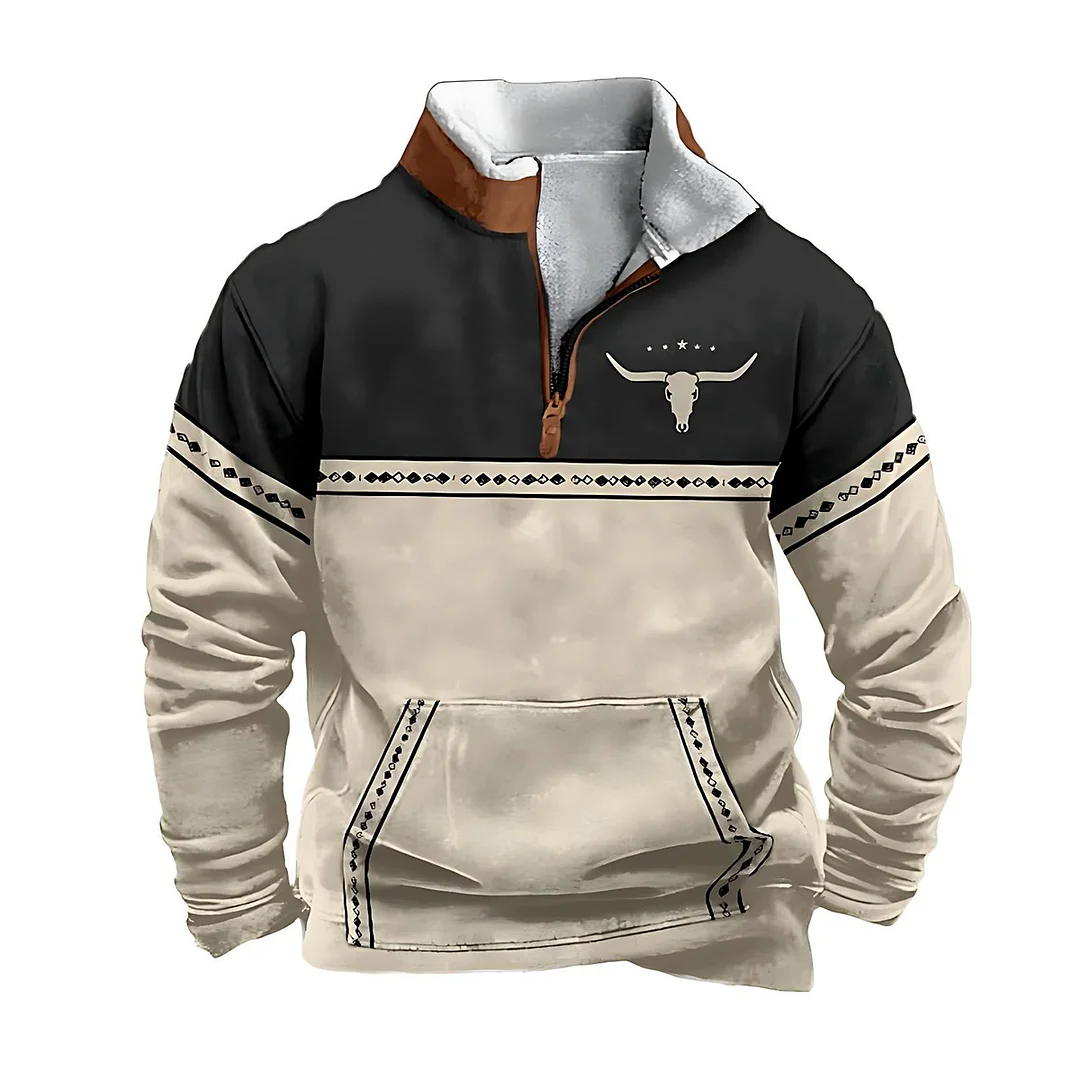 💥 2025 Hot Sale!Men's Western Fleece Jacket Cowboy Bull Head Print Pullover 1/4 Zip Stand Collar LongSleeve Sweatshirts