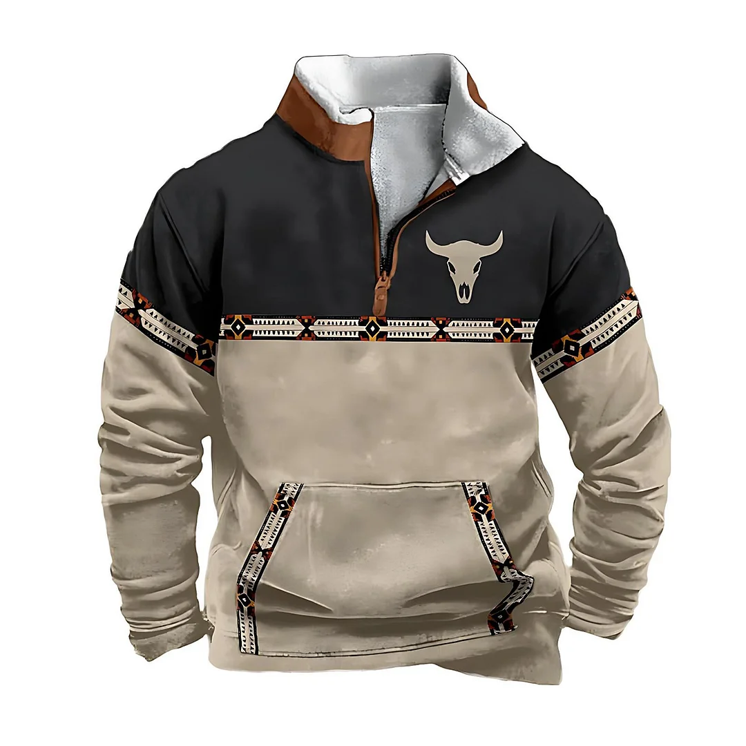 💥 2025 Hot Sale!Men's Western Fleece Jacket Cowboy Bull Head Print Pullover 1/4 Zip Stand Collar LongSleeve Sweatshirts