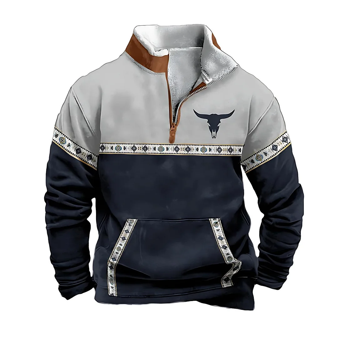 💥 2025 Hot Sale!Men's Western Fleece Jacket Cowboy Bull Head Print Pullover 1/4 Zip Stand Collar LongSleeve Sweatshirts