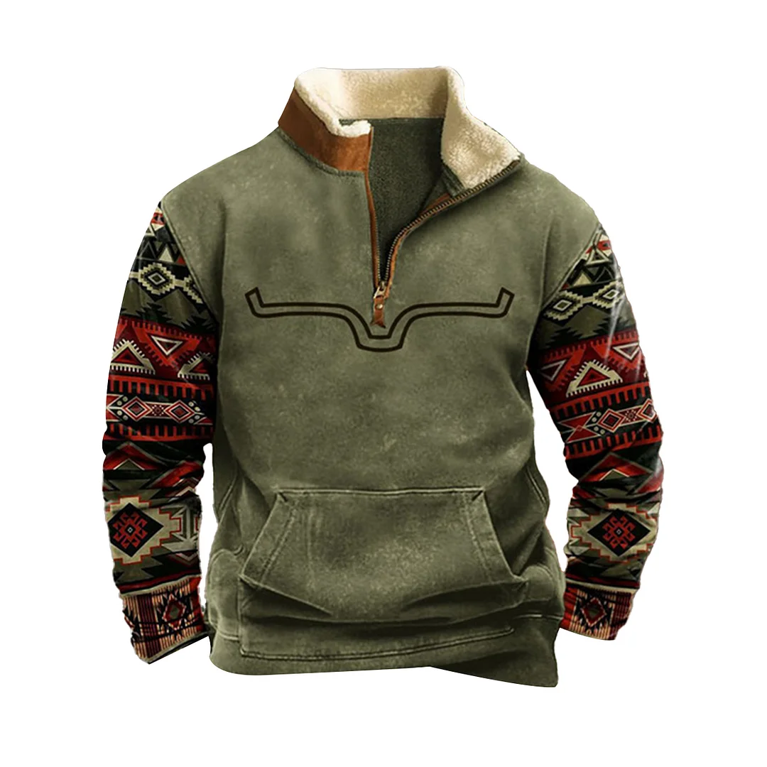 💥 2025 Hot Sale! Mens Western Fleece Jacket Cowboy Bull Head Print Pullover 1/4 Zip Up Stand Collar Country Sweatshirts Western Gifts For Men With Pocket